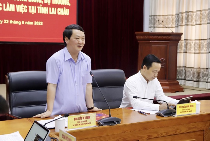 Phát biểu tại buổi làm việc, Bộ trưởng, Chủ nhiệm UBDT Hầu A Lềnh bày tỏ đồng tình và phấn khởi khi tỉnh Lai Châu dành nhiều sự quan tâm đến vùng đồng bào DTTS và miền núi bằng nhiều chính sách riêng của địa phương, nhằm giải quyết những khó khăn, bức thiết nhất ở vùng đồng bào DTTS.