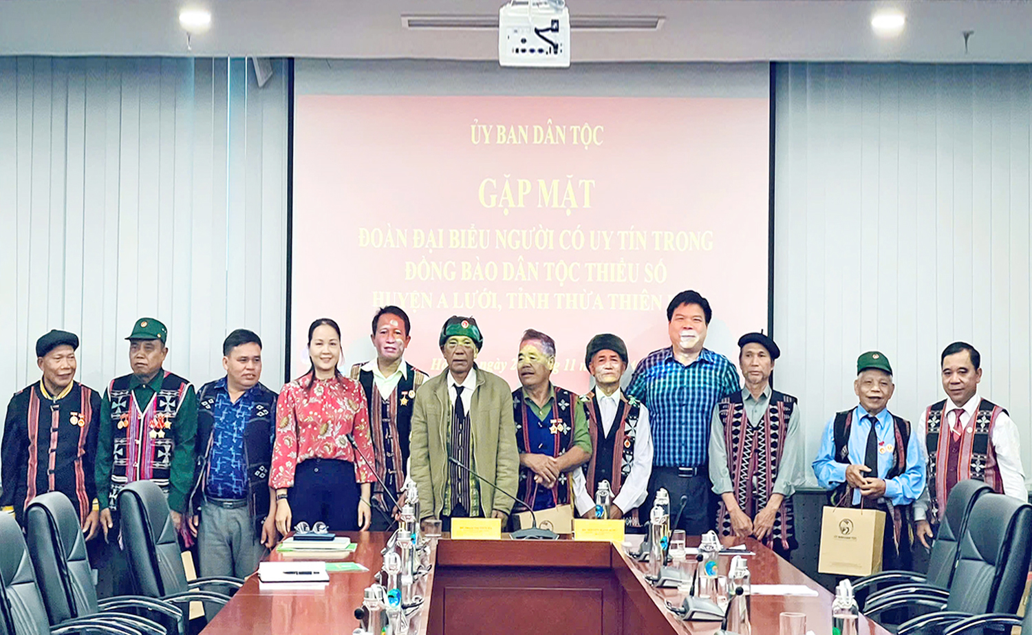 Chiều 28/11, tại trụ sở Ủy ban Dân tộc (UBDT), thừa ủy quyền của Lãnh đạo UBDT, bà Phạm Thị Thúy Hà, Phó Vụ trưởng Vụ Dân tộc thiểu số đã có buổi gặp mặt thân mật các đại biểu Người có uy tín (NCUT) tiêu biểu trong đồng bào DTTS huyện A Lưới, tỉnh Thừa Thiên Huế nhân dịp Đoàn ra thăm Thủ đô Hà Nội. Tham dự buổi gặp mặt có đại diện lãnh đạo một số vụ, đơn vị thuộc UBDT.