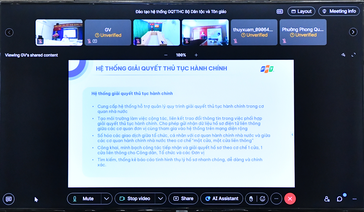 Tại Hội nghị, đại biểu tham dự đã được nghe các chuyên gia đến từ Công ty cổ phần FPT giới thiệu tổng quan về Hệ thống, trong đó đề cập đến các tính năng, chức năng của Hệ thống; hướng dẫn quy trình tiếp nhận, xử lý và trả kết quả hồ sơ TTHC trên môi trường điện tử.