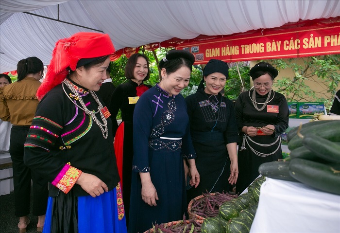 Thứ trưởng, Phó Chủ nhiệm UBDT Nông Thị Hà tham quan một số gian hàng trưng bày sản phẩm nông nghiệp tiêu biểu của tỉnh Hà Giang.