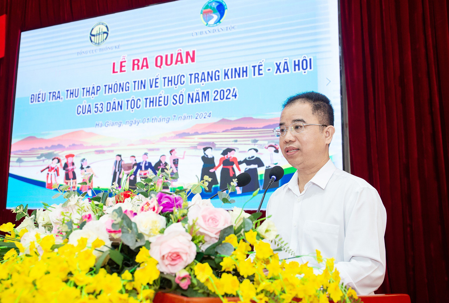 01:30 PM 01/07/2024 | Lượt xem: 3223 In bài viết |Ngày 01/7/2024, tại huyện Vị Xuyên, tỉnh Hà Giang, Ủy ban Dân tộc (UBDT) phối hợp với Tổng Cục Thống kê tổ chức Lễ ra quân điều tra, thu thập thông tin về thực trạng kinh tế - xã hội của 53 dân tộc thiểu số năm 2024. Bà Nông Thị Hà, Thứ trưởng, Phó Chủ nhiệm UBDT cùng ông Lê Trung HIếu, Phó Tổng Cục trưởng Tổng cục Thống kê đồng chủ trì Lễ ra quân.